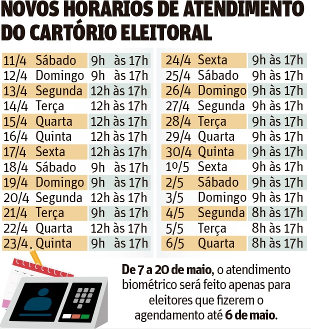 O atendimento é somente para quem precisa fazer o alistamento, regularizar título cancelado, transferir domicílio eleitoral ou registrar a biometria pela primeira vez. Quem já tem a biometria pode resolver todas essas questões na área ‘Título Net’, no site do Tribunal Superior Eleitoral (TSE): www.tse.jus.br/servicos-eleitorais/titulo-eleitoral/autoatendimento-eleitoral/.